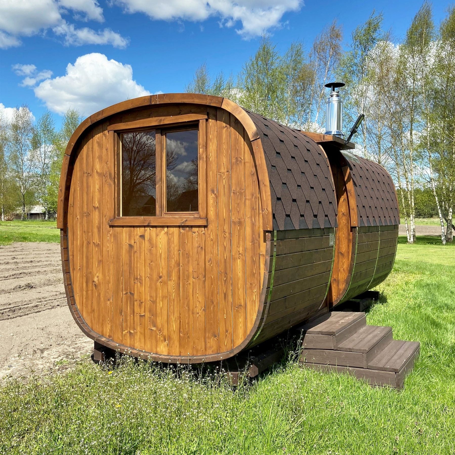 En kvadratisk badstu med særpreg og karakter. Eldstova skiller seg ut med sitt unike design og lett avrundede hjørner som ikke bare gir mer plass, men også en større følelse av komfort.